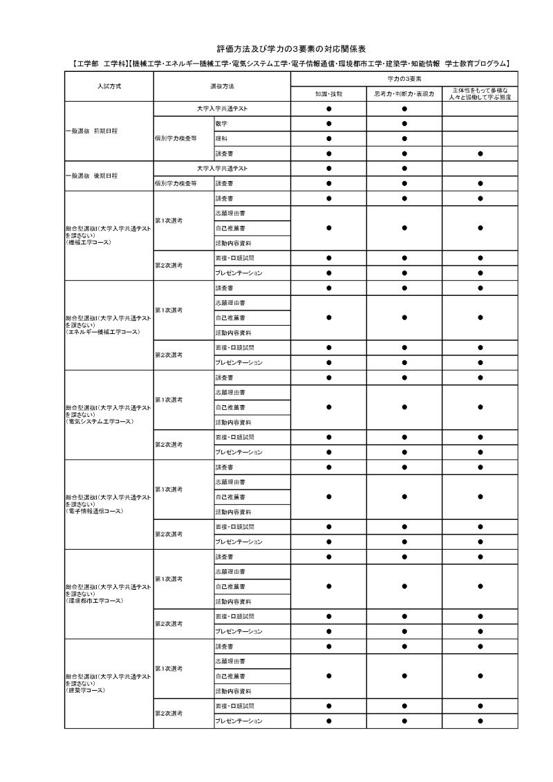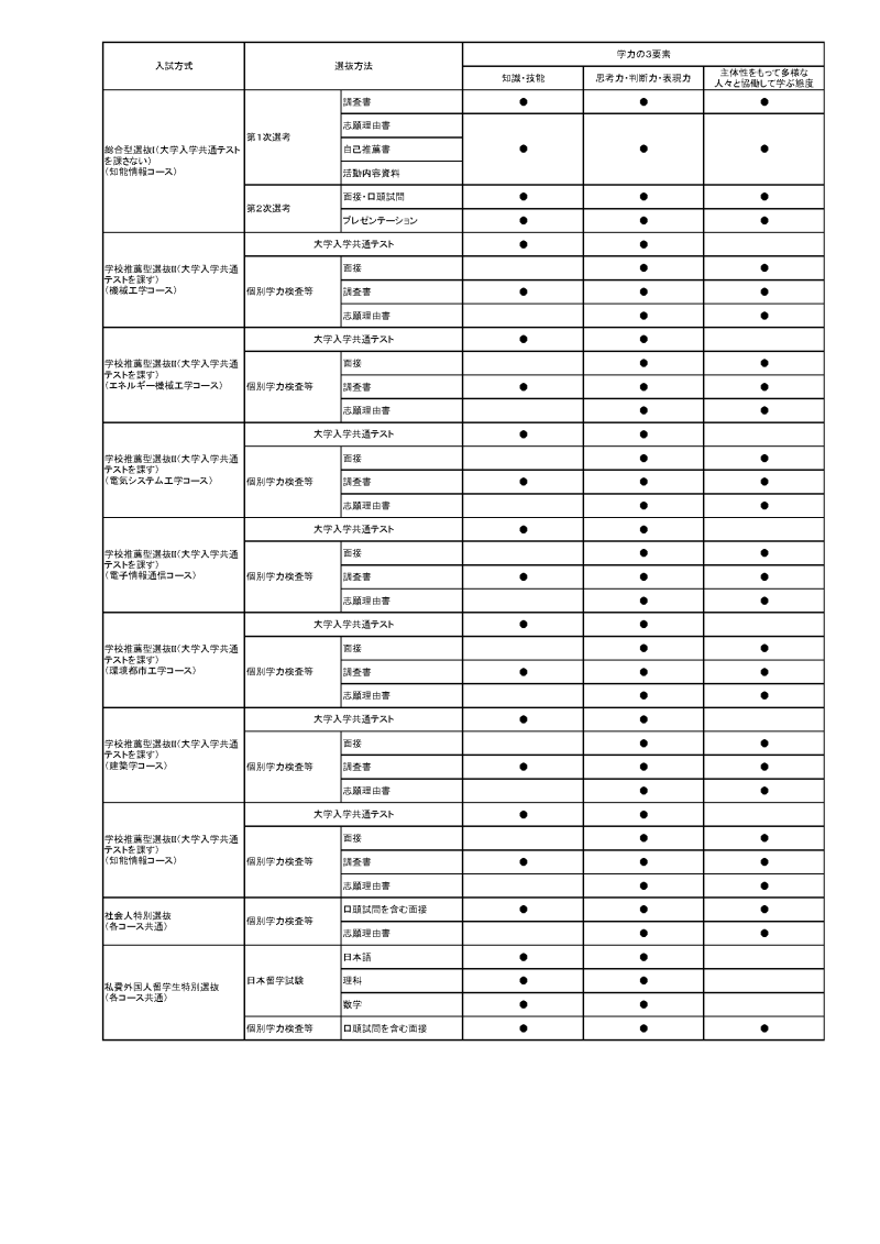 学校推薦型選抜II(大学入学共通テストを課す)では大学入学共通テスト及び個別学力検査(面接及び志願理由書、調査書、推薦書)を課しています。大学入学共通テストでは、特に数学、理科、外国語、情報の基礎学力を重視し、論理的思考力が身に付いているかを評価します。個別学力検査では、面接及び志願理由書、調査書により環境都市工学コースの専門分野に対する強い向学心、高等学校等での主体的な活動、思考力や判断力を評価します。 - 社会人特別選抜