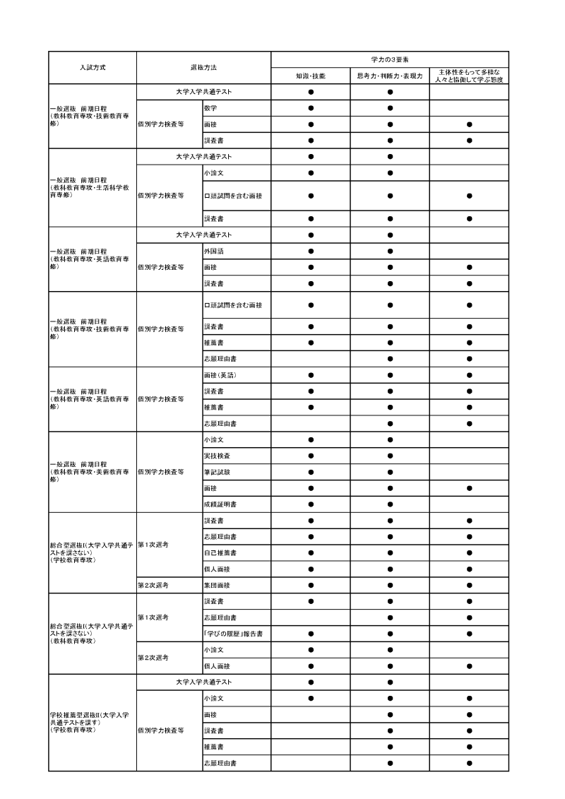 - 大学での学びの土台となる基礎学力をもち、多面的な観点から物事を考察し、多様な人々と協働しながら自分なりの意見をまとめることができる人