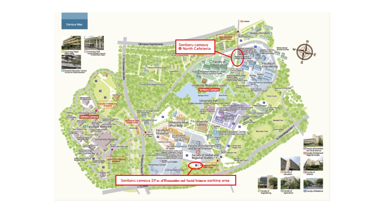 (1) Senbaru campus(① North Cafeteria ②Faculty of Humanities and Social Sciences parking area)