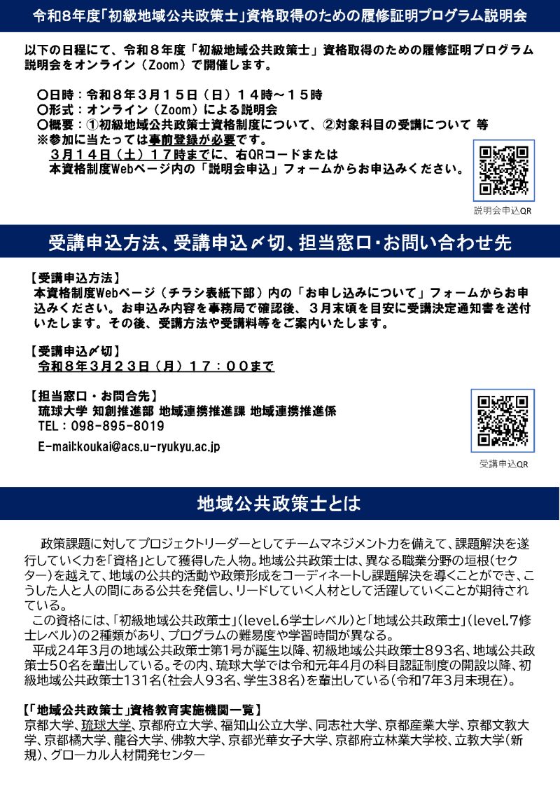 令和8年度 琉球大学初級地域公共政策士資格取得プログラムの募集を開始しました! 目標4:質の高い教育をみんなに目標11:住み続けられるまちづくりを