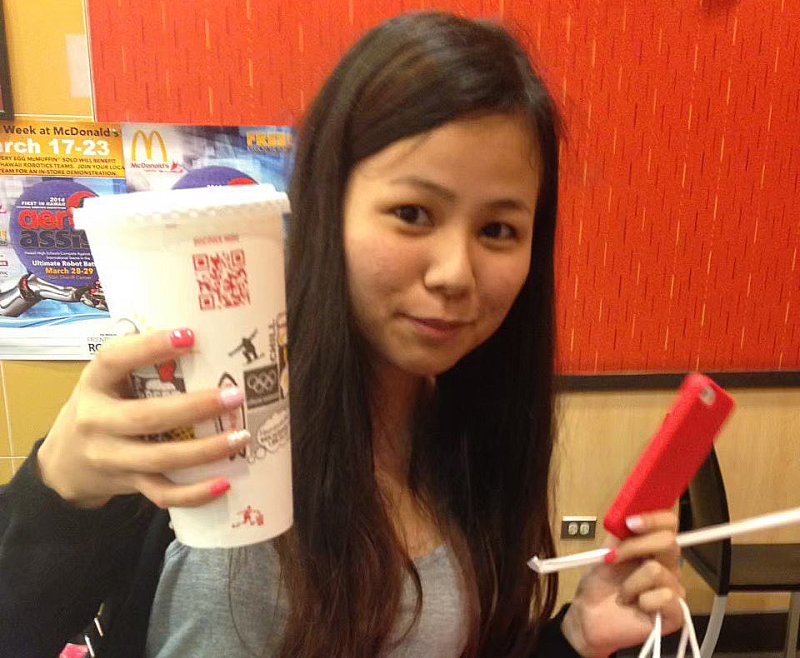 ハワイ研修(ドリンクのサイズに驚いている写真)