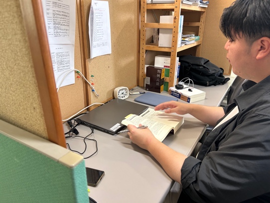 私は沖縄県出身ですが、学習時間を確保するため、今年度から琉球大学の学生寮(千原寮)で生活しています。普段は、朝に自習室へ向かって予習や課題に取り組み、その後講義や演習を受講し、授業後は再び自習室で勉強を続け、夜に帰寮するという一日を送っています。試験期間には、最長で13時間ほど勉強したこともあります。また、学生同士でのゼミにも積極的に取り組んでいます。