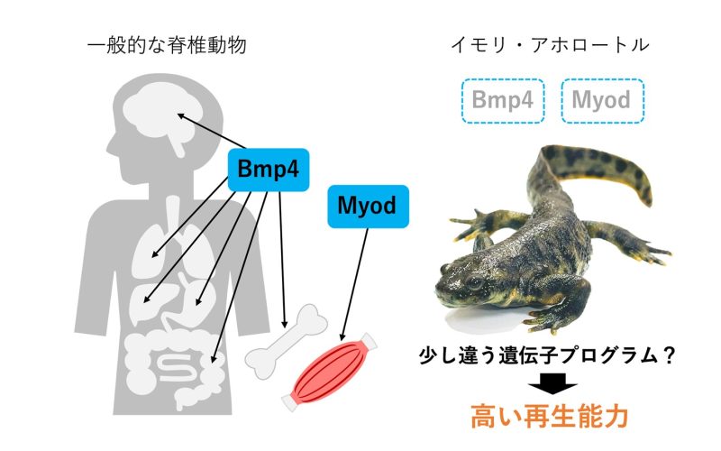脊椎動物の体の形作りに欠かせない形態形成遺伝子#7のいくつかが、有尾両生類において失われている可能性が高いこともわかりました。Bmp4(骨形成因子4)は脳、眼、内臓、歯や骨など動物の幅広い組織や器官の形成に重要な遺伝子ですが、イモリやアホロートルでは失われている可能性がわかりました。また、MyoD遺伝子は筋肉の形成に重要であり、ヒトを含む他の脊椎動物には必ず存在しています。イモリやアホロートルにも筋肉がありますが、Bmp4と同様にMyoD遺伝子も失われている可能性が高いことが明らかになりました。このことから、進化の過程で他の脊椎動物とは少し違った形態形成遺伝子プログラムを持つようになり、それが高い再生能力にも関連しているのかもしれません。