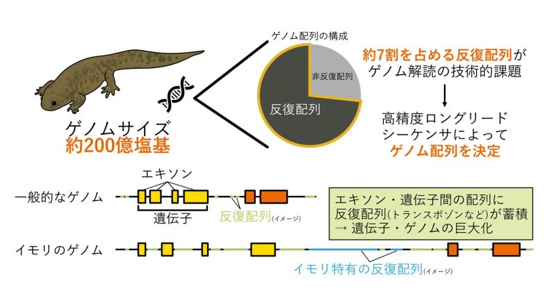 有尾両生類であるイモリは、身近でありながらユニークな特徴を備えた、生物学研究にとって重要な動物の一つです。そのため、古くから発生の仕組みや繁殖行動の謎などを解き明かす研究に貢献してきました。特に、失われたり傷ついたりした組織や器官を元通りに修復する非常に高い器官再生能力を持っており、再生医学の研究対象にもなっています。モデル動物として近年注目されているイベリアトゲイモリは、生物学研究に欠かせない近交系統が日本で樹立維持されています。また国内の一部のメンバーも参加した国際共同研究プロジェクトでは、今年の2月に野生型イベリアトゲイモリの染色体レベルでのゲノム解読を報告しました#2。このイモリを用いた実験を深く広く発展させるためには近交系統のゲノム決定が必要でした。しかしながら、反復配列#3に富んだヒトの約7倍といった非常に大きなゲノム(20G、200億塩基対)#4であるため、技術的な壁が高く、その解読は困難とされていました。