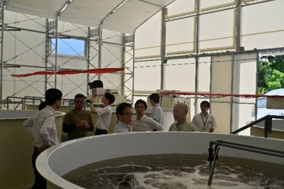 意見交換後、研究共創機構産学官共創ユニットの羽賀特命教授の案内、説明のもと、COI-NEXT陸上養殖施設を見学され、養殖されている琉大ミーバイ(和名:ヤイトハタ)への餌やりも体験されました。