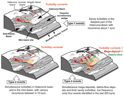 図5 波照間海盆に規模の異なるイベント(Typhe-1から3)によって堆積物がたまる様子。右下のTyphe-3のイベントが最も規模が大きく、タービダイト、大規模堆積物、水中土石流堆積物の3つのイベントが重なっている。このイベントは20万年間で4回生じた。出典:本論文のFig. 13