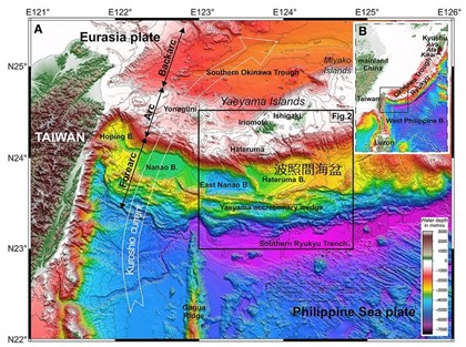 図1 南琉球の海溝から背弧(沖縄トラフ)にかけての海底地形図。黒枠内の波照間海盆が調査された海域。