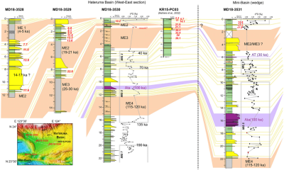 琉球大学理学部物質地球科学科 新城 竜一 教授と大学院生の相澤 正隆 氏(現・北海道教育大学 講師)は、フランスの海洋調査船R/V Marion Dufresne号を用いた2018年のフランス-台湾合同調査MD214(EAGER)航海に同行しました。この航海調査では南琉球の前弧にあたる波照間海盆と外縁隆起帯において、4地点で堆積物の柱状コアを採取しました(図1、2)。コアの長さは約13.4 mから23.6 mです。得られたコアの堆積物を対象に(図3)、放射性炭素年代、酸素同位体層序、U・Th系列核種による堆積物の年代推定、さらに火山灰(火山ガラス)の主成分・微量元素およびHf–Pb–Sr–Nd同位体比によるテフロクロノロジーを組み合わせて、重力流堆積物(タービダイトなど)の層序と起源を精査しました。その結果、海盆の底では半遠洋性堆積物の堆積速度が1000年間で3〜8 cm(局所的には、1000年間で60 cmより大きい)であること、過去2万年間に24件、そして過去20万年間では48件の大規模な重力流イベントが発生したことを明らかにしました(図4、5)。これらのイベントは、マグニチュード7以上の巨大地震およびそれに伴う大津波が、千年スケールで繰り返し起こったことを示しています。特に、4つの大規模な堆積物(Homogenite)層は規模・広がりの点で他と一線を画し、その発生機構の解明は今後の課題ですが、巨大地震および津波に関係している可能性が高いと考えられます。