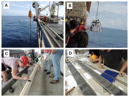 図3 A: ピストンコアの機材を海底へむけて投入するところ。B: 同じ地点で一番表層の堆積物層のみを採取するための採泥装置を投入するところ。C: 採取されたコアの塩ビパイプに番号をふっているところ。このあと1.5mの長さ(黒テープが目印)に切断する。D: 半分にカットしたコアの内部を観察しているところ。半遠洋性の泥の層に砂質堆積物が多数挟まっている様子。(Photo: 新城竜一)