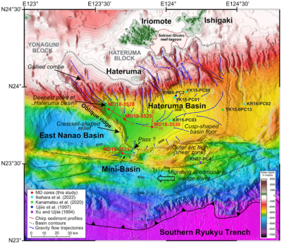 図2 波照間海盆周辺の詳細海底地形図。赤丸(MD18-3528〜3531)が本研究で堆積物コアを採取した地点。青矢印の線は、波照間海盆へ重力流堆積物が供給されたと推定される主なルート(八重山諸島から前弧へかけて発達する海底谷地形群)を示す。出典:本論文のFig. 2