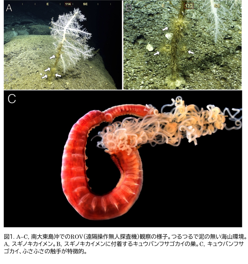 名古屋大学大学院理学研究科附属臨海実験所の自見直人講師らの研究チームは、海洋研究開発機構(JAMSTEC)、産業技術総合研究所および琉球大学との共同調査において、南大東島沖の深海(水深843メートル)で、カイメンに付着して生活する新種のゴカイを発見しました。本種は「キュウバンフサゴカイ Lanice spongicola sp. nov.」と命名されました。