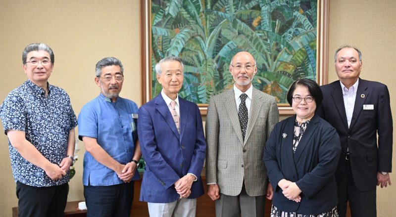 ![]() (左から)仲里学生部長、比嘉基金室長、吉武 登様、吉武 晃様、喜納学長、福治理事 |