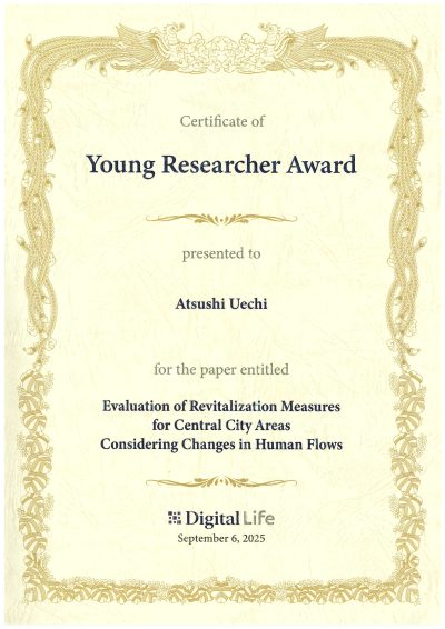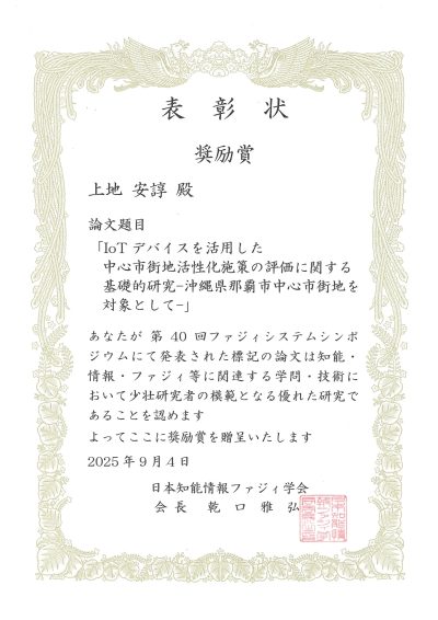 工学部社会基盤デザインコース 上地安諄助教らの論文が、2025年度日本知能情報ファジィ学会「奨励賞」およびJournal of Digital Life「Young Researcher Award」を受賞しました。