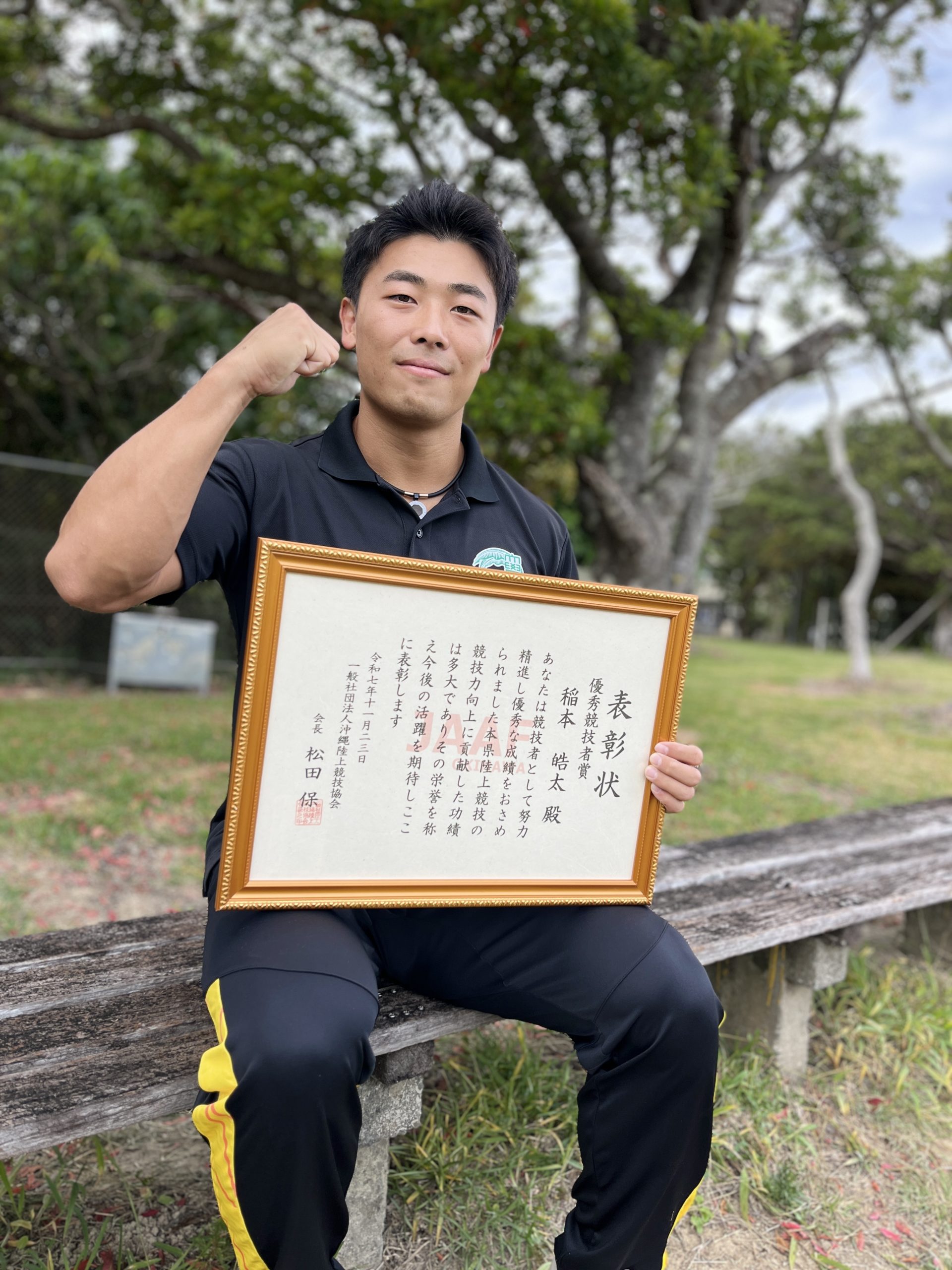 琉球大学教育学部保健体育専修4年次の稲本皓太さんが、沖縄陸上競技協会から令和7年度優秀競技者賞を受賞しました。