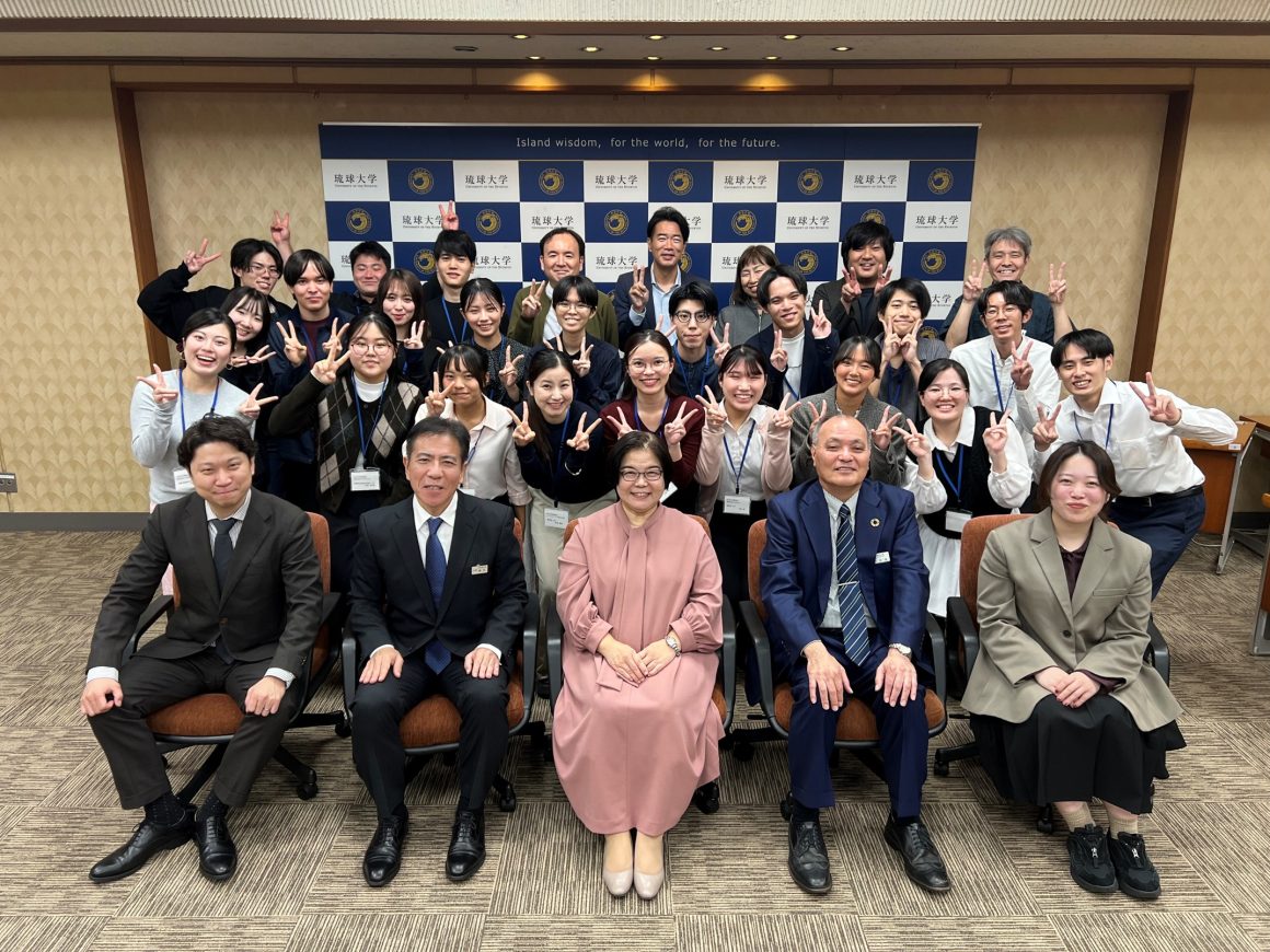 発表後には喜納学長より「社会には多様な人々がいる。いろんな人との交流を通して『なぜ自分は大学でこの勉強をしているのか』を見つめ直し、目的意識にも刺激をもらったと思う。企業が求める人材のスキルに「コミュニケーション能力」と必ず言われてきた。生成AIの時代が来ても、どうしても補えないものは“人間の感じるチカラ”や“身体で経験すること”それに加えて“人に対してどう接するか”という点がある。インターンシップで「お客様」や「企業」など多様な視点を少し経験できたと思うので、世の中はそういう多様性で形づくられていることも意識して活躍してほしい。学長としてみなさんのことを誇らしく思う。この経験を活かして今後とも研鑽に励んでいただきたい。」との総評をいただきました。