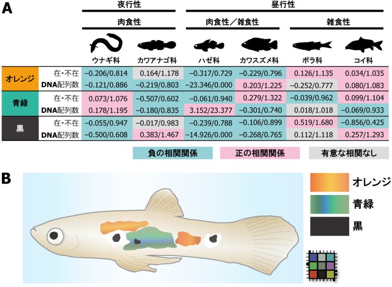 図3.沖縄のグッピー生息地で検出される魚類グループとグッピー雄成魚の色斑の大きさの相関関係.(A) 本研究で調査したグッピー生息地8か所・4時点から、合計4回以上検出された魚類6科の存在および環境DNA検出配列数と、305個体のグッピー雄成魚の色斑3種の相対面積について相関解析を行った.(B) 本研究で行った画像解析の模式図。オレンジ、青緑(構造色)、黒の色斑面積(ピクセル数)について、固定距離カメラで撮影して色斑/体表の相対面積を解析した