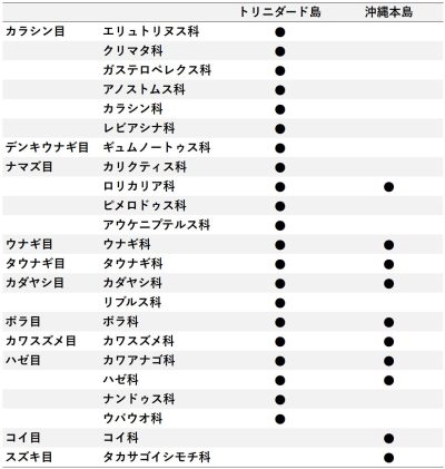 図2.グッピー原産地(トリニダード島)と沖縄グッピー生息地の魚類相の比較