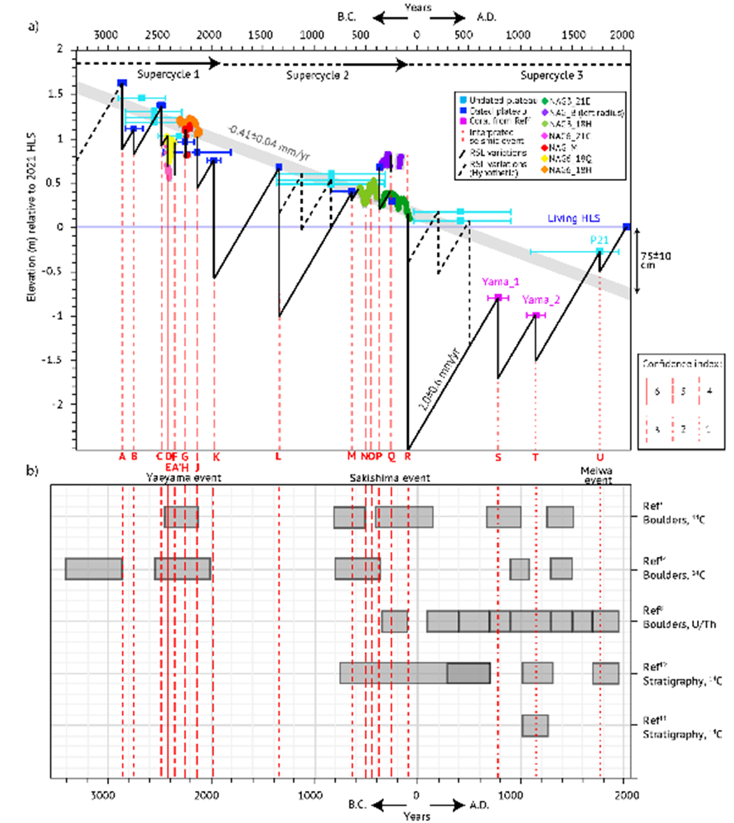a) 名蔵における過去約5000年間の相対的海水準変化の復元。マイクロアトールの段差から推定された地盤の隆起と沈降の履歴を示す。赤い破線は地震に伴う隆起イベントを表す。黒い矢印は、各地震スーパーサイクルの時間的区分を示す。点線は静穏期、実線は活動期の期間を示す。