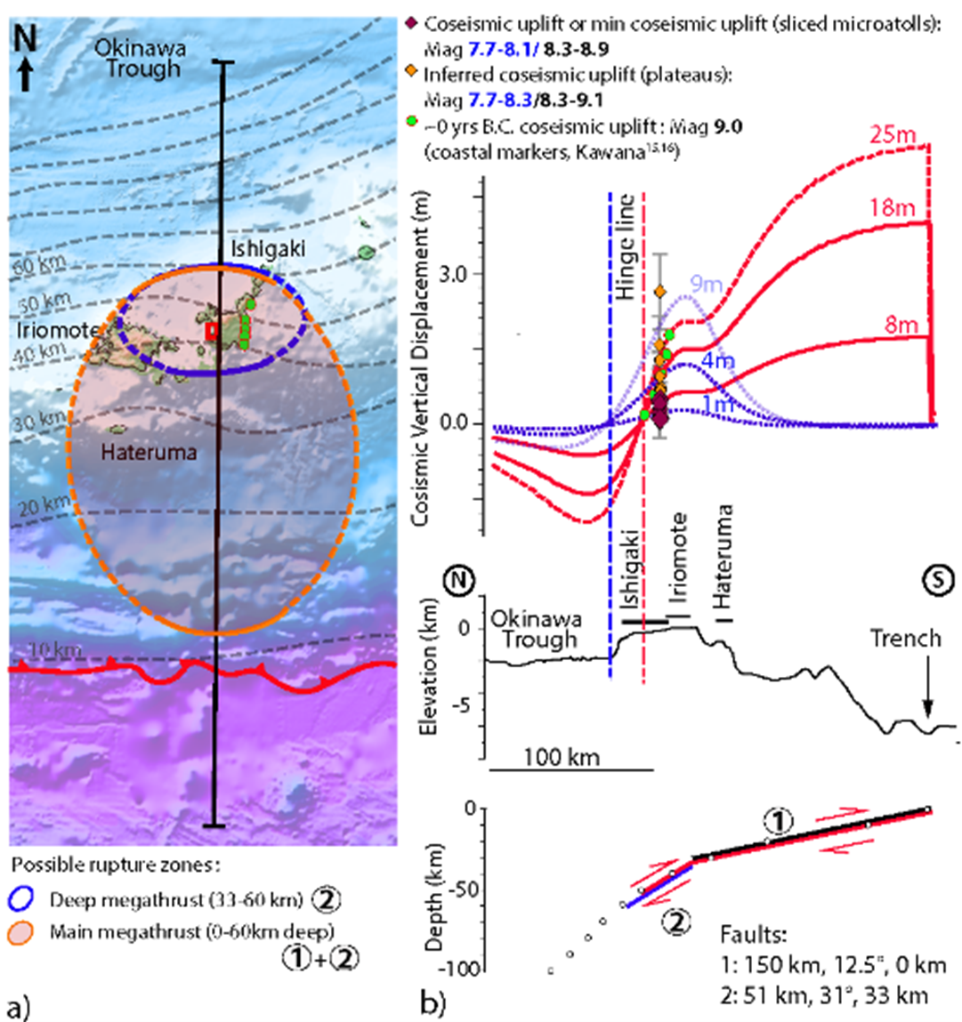 b):名蔵で推定された地盤隆起量と地震モデルの比較。色付きの点は過去の隆起量、線は地震による地盤変動の再現結果を示す。浅い場所で大きくすべる地震と、やや深い場所で起きる地震による隆起パターンの違いを表している。