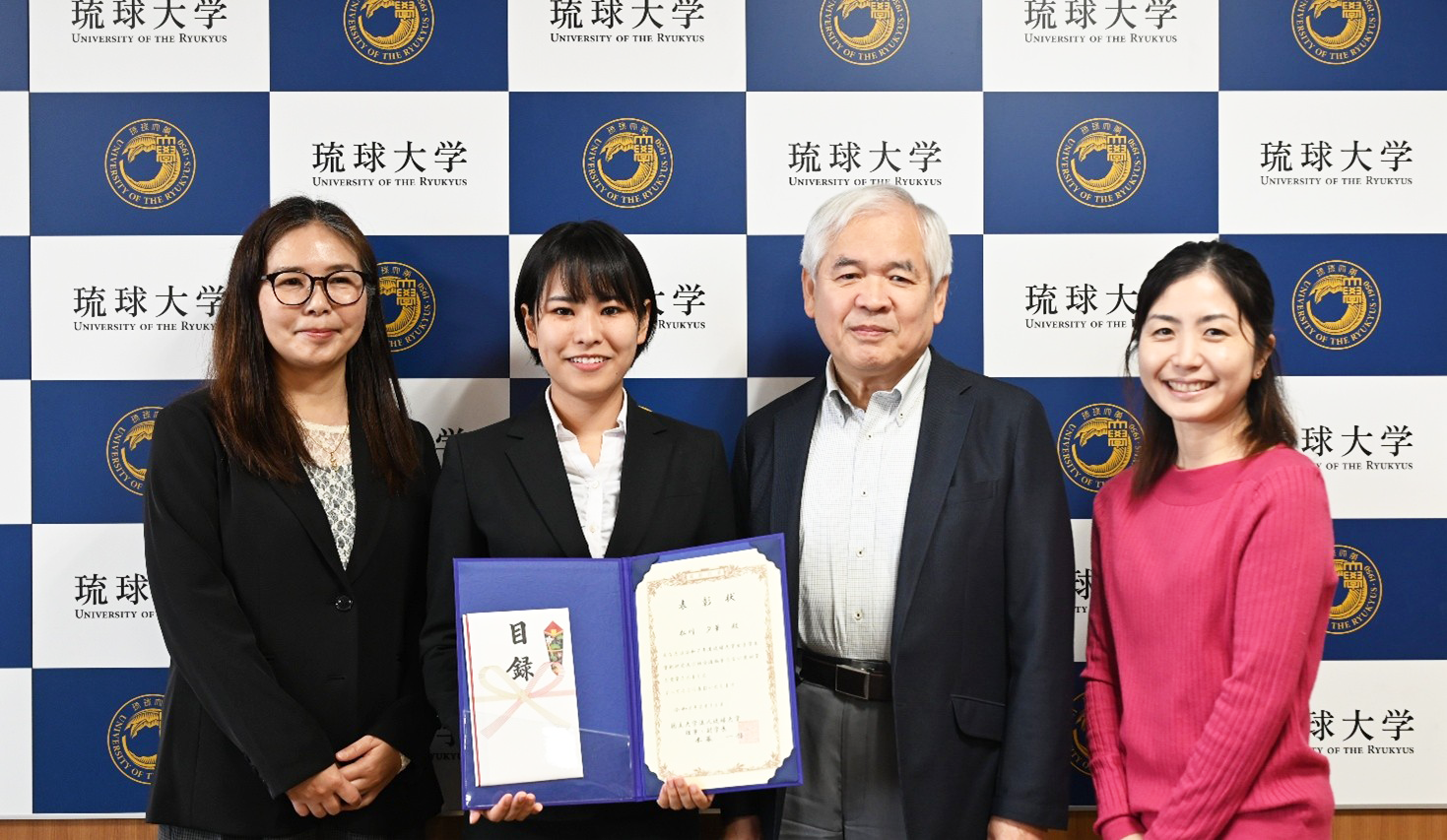2025年2月16日(月)に、令和7年度琉球大学女子学生学術研究及び社会活動等うない奨励賞の表彰式が行われました。本賞は、琉球大学基金である「琉球大学うない女性研究者・リーダー育成基金」による事業の一環として令和3年度に創設され、将来を担う優秀な女性リーダーの育成を目的に、本学の女子学生の意欲的な研究活動や社会貢献等の活動を表彰するものです。