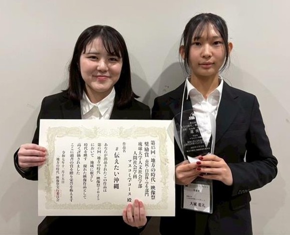 人文社会学部人間社会学科社会学プログラムマスコミ学コース3年次の雨瀬萌乃さんと大城藍礼さんが、第45回「地方の時代」映像祭2025の学生・自治体部門に、映像作品「#伝えたい沖縄」を出品し、2025年11月15日、関西大学千里山キャンパスで行われた贈賞式で奨励賞を受賞しました。