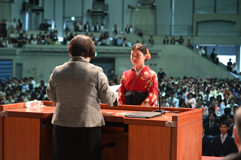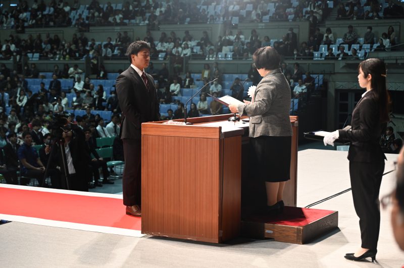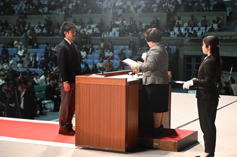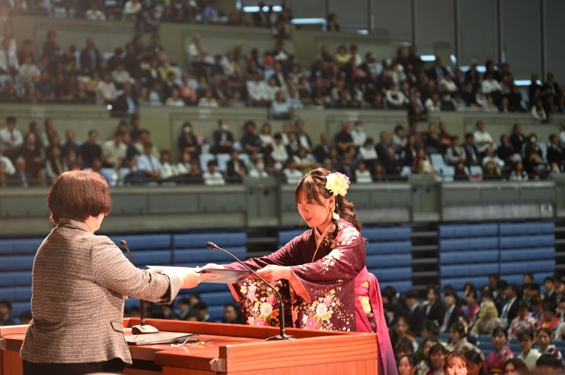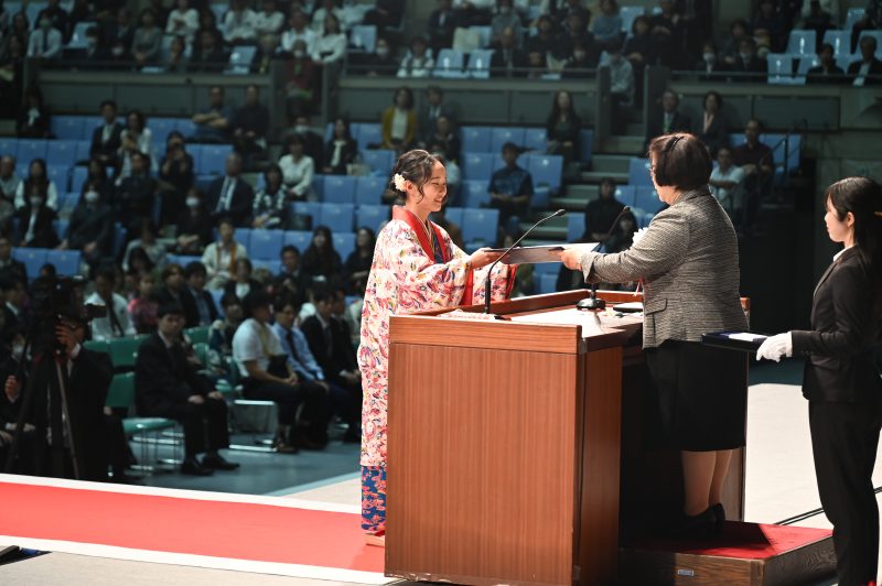 昨年に引き続き、ご家族等も参加いただき、吹奏楽部の演奏、教育学部音楽科による合唱で幕を開け、華やかな式典となりました。式典の様子はインターネットにてライブ配信されました。