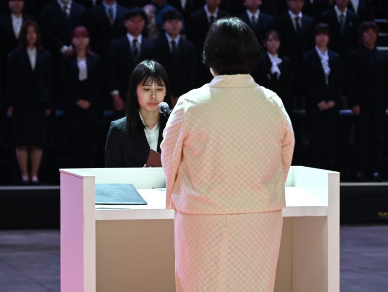 その言葉を受けて、学部入学生代表として加那原 季子さん(理学部 海洋自然科学科)から、「私達は、学生としての本分に従って学業に励み、人間性を豊かにし、学則をはじめとする本学諸規則を遵守することを誓います。」との宣誓がありました。続いて、大学院入学生代表として島袋 真理さん(理工学研究科)から「私達は、学生としての本分に従って学術を探究し、その深奥を極めるべく精進するとともに、大学院学則をはじめとする本学諸規則を遵守することを誓います。」との宣誓がありました。