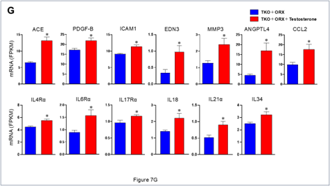 最後に、NO合成酵素非存在下におけるテストステロンの有害な心血管作用に関与していることが予想される代表的な遺伝子をピックアップした。動脈硬化の成因に関与していることが報告されているACE (angiotensin-converting enzyme), PDGF-B (platelet-derived growth factor-B), ICAM1 (intracellular adhesion molecule-1), END3 (Endothelin-3), MMP3 (matrix metalloproteinase-3), ANGPTL4 (angiopoietin-4), CCL2 (also known as MCP-1, monocyte chemoattractant protein-1), IL4Rα (interleukin-4 receptor alpha), IL6Rα, IL17Rα, IL18, IL21Rα, IL34などのmRNAの発現レベルが、テストステロン未投与のTKO-ORXマウスと比較してテストステロンを投与した同マウスにおいて有意に増加していた(Figure 7G)。