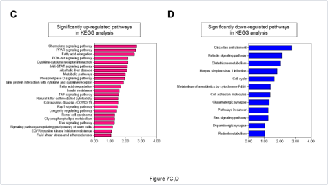 Kyoto Encyclopedia of Genes and Genomes (KEGG) pathway解析では、テストステロン未投与のTKO-ORXマウスと比較してテストステロンを投与した同マウスにおいて増加していたmRNAsの解析において、炎症、免疫、代謝を介した機序が関与していることがGene ontology term enrichment解析と同様に示唆された(Figure 7C)。テストステロン未投与のTKO-ORXマウスと比較してテストステロンを投与した同マウスにおいて低下していたmRNAsの解析では、分子機序を説明しうる有意なpathwayはなかった(Figure 7D)。