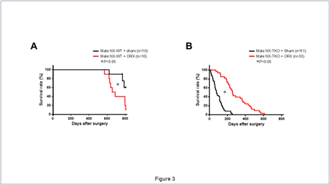 オスNX-WTマウスでは、ORXは偽手術と比較して生存率を有意に増悪させたが(Figure 3A)、一方、オスNX-TKOマウスでは、ORXは偽手術と比較して生存率を逆に有意に改善させた(Figure 3B)。