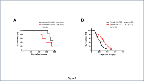 メスNX-WTマウスでは、OVXは偽手術と比較して生存率を増悪させる傾向を示したが(Figure 2A)、一方、メスNX-TKOマウスでは、OVXは偽手術と比較して生存率を逆に有意に改善させた(Figure 2B)。
