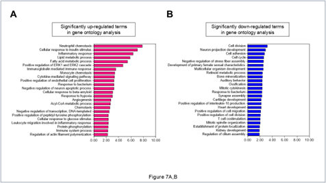 Gene ontology term enrichment解析において、テストステロン未投与のTKO-ORXマウスと比較してテストステロンを投与したTKO-ORXマウスにおいて増加していたmRNAsの解析では、炎症、免疫、代謝を介した機序が関与していることが示唆された(Figure 7A)。一方、テストステロン未投与のTKO-ORXマウスと比較してテストステロンを投与した同マウスにおいて低下していたmRNAsの解析では、分子機序を説明しうる有意なbiological process termはなかった(Figure 7B)。