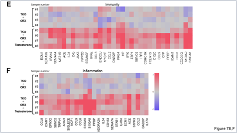 これらの結果を踏まえて、私達は有意に発現レベルが変化していた遺伝子のヒートマップを作成した。テストステロン未投与のTKO-ORXマウスと比較してテストステロンを投与した同マウスにおいて、免疫に関係する34の遺伝子(Figure 7E)および炎症に関係する25の遺伝子(Figure 7F)が有意に増加していた。