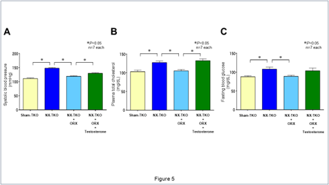 偽手術と比較して2/3腎摘術(NX)はオスTKOマウスの収縮期血圧(Figure 5A)、血漿総コレステロール値(Figure 5B)、および空腹時血糖値(Figure 5C)を有意に増加させた。ORXは、オスNX-TKOマウスにおけるそれらの値をすべて有意に改善させた。テストステロン長期皮下投与は、オスNX-TKO-ORXマウスにおける収縮期血圧と血漿総コレステロール値を有意に悪化させ、空腹時血糖値を増悪させる傾向を示した。