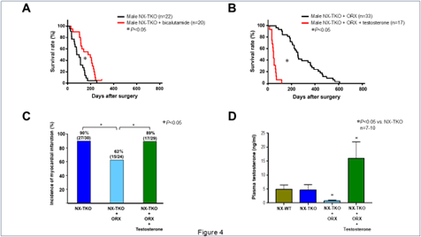 NX-TKOマウスの生存率における作用はOVXよりもORXの方が大きかったので(Figure 2B vs. 3B)、私達は、男性ホルモン テストステロンの作用に焦点を当てて以下の研究を行った。選択的・競合的アンドロゲン受容体拮抗薬ビカルタミドの長期経口投与は、オスNX-TKOマウスの生存率を有意に改善させた(Figure 4A)。テストステロン長期皮下投与はオスNX-TKO-ORXマウスの生存率を有意に悪化させた(Figure 4B)。ORXは、オスNX-TKOマウスの心筋梗塞罹患率を有意に改善させたが、一方、テストステロン長期皮下投与はオスNX-TKO-ORXマウスの心筋梗塞罹患率を有意に悪化させた(Figure 4C)。血漿テストステロンレベルはNX-WTマウスとNX-TKOマウスの間では差はなかった。ORXは、NX-TKOマウスの血漿テストステロンレベルを有意に低下させ、テストステロン長期皮下投与は、NX-TKO-ORXマウスの血漿テストステロンレベルをNX-WTマウスやNX-TKOマウスの血漿テストステロンレベルの3倍程度まで有意に増加させた(Figure 4D)。