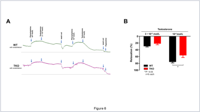3×10-5 mol/Lと10-4 mol/Lのテストステロンは、フェニレフリンで収縮させたオスのWTマウスとTKOマウスの大動脈において内皮非依存性弛緩反応を引き起こした。テストステロンによる内皮非依存性弛緩反応は、WTマウスの大動脈と比較してTKOマウスの大動脈で有意に障害されていた(Figure 6A,B)。