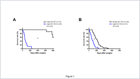 生存率は、オスのNX-WTマウスと比較してオスのNX-TKOマウスにおいて有意にそして著明に低下していた(Figure 1A)。私達は、NX-TKOマウスの生存率に性差が存在するのか否か、そしてもし存在すれば、その機序に性ホルモンが関与しているのか否かを検討した。生存率は、メスのNX-TKOマウスに比してオスのNX-TKOマウスで有意に低下していた(Figure 1B)。